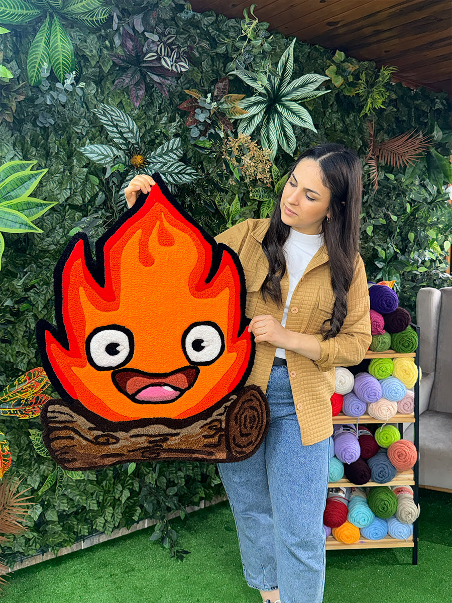 Calcifer Edition 01 | Handmade Tufted Rug; adds a unique touch to your home decor with its warm and energetic design! The adorable and eye-catching flame figure of Calcifer, one of Studio Ghibli's unforgettable characters, brings this rug to life. Offering both a fun and aesthetic look with its vibrant color tones and detailed texture, this rug is crafted from 100% acrylic yarn and hand-tufted to ensure long-lasting use.