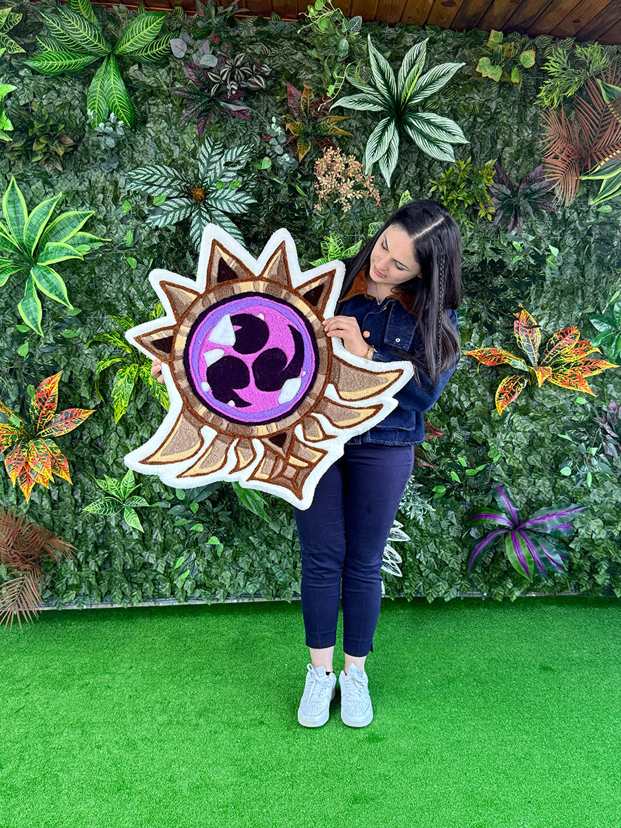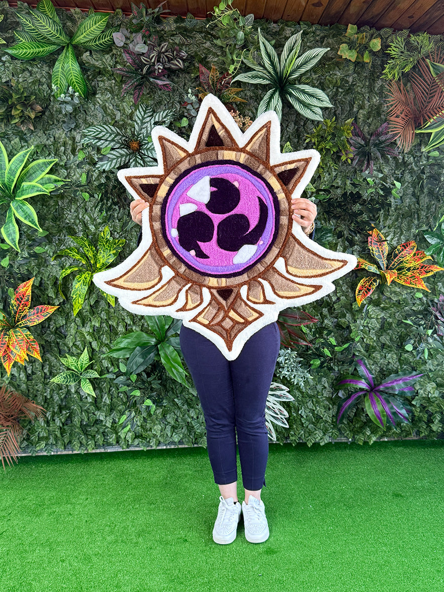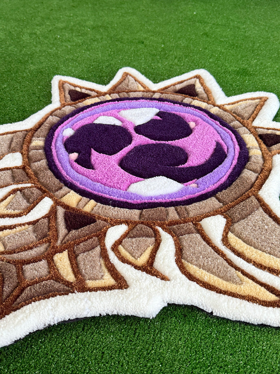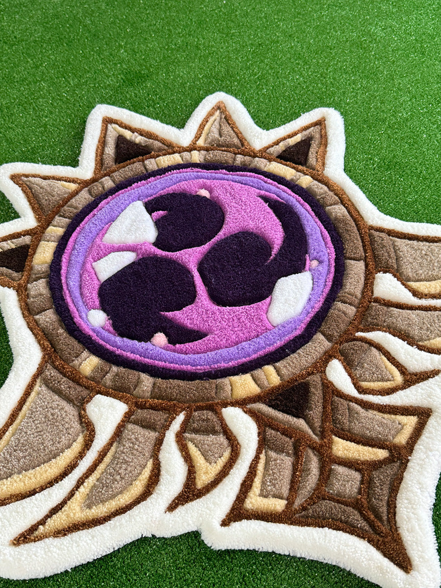 The Electro Vision Edition | Handmade Tufted Rug; adds a powerful vibe to your gaming corner with its striking purple and gold tones. Thanks to the expert carving craftsmanship, the details are vivid, deep, and feature a stunning 3D effect. It performs perfectly on the floor with its non-slip backing, but can also be easily displayed on the wall using the hidden hanging points on the back. Display it wherever you wish.