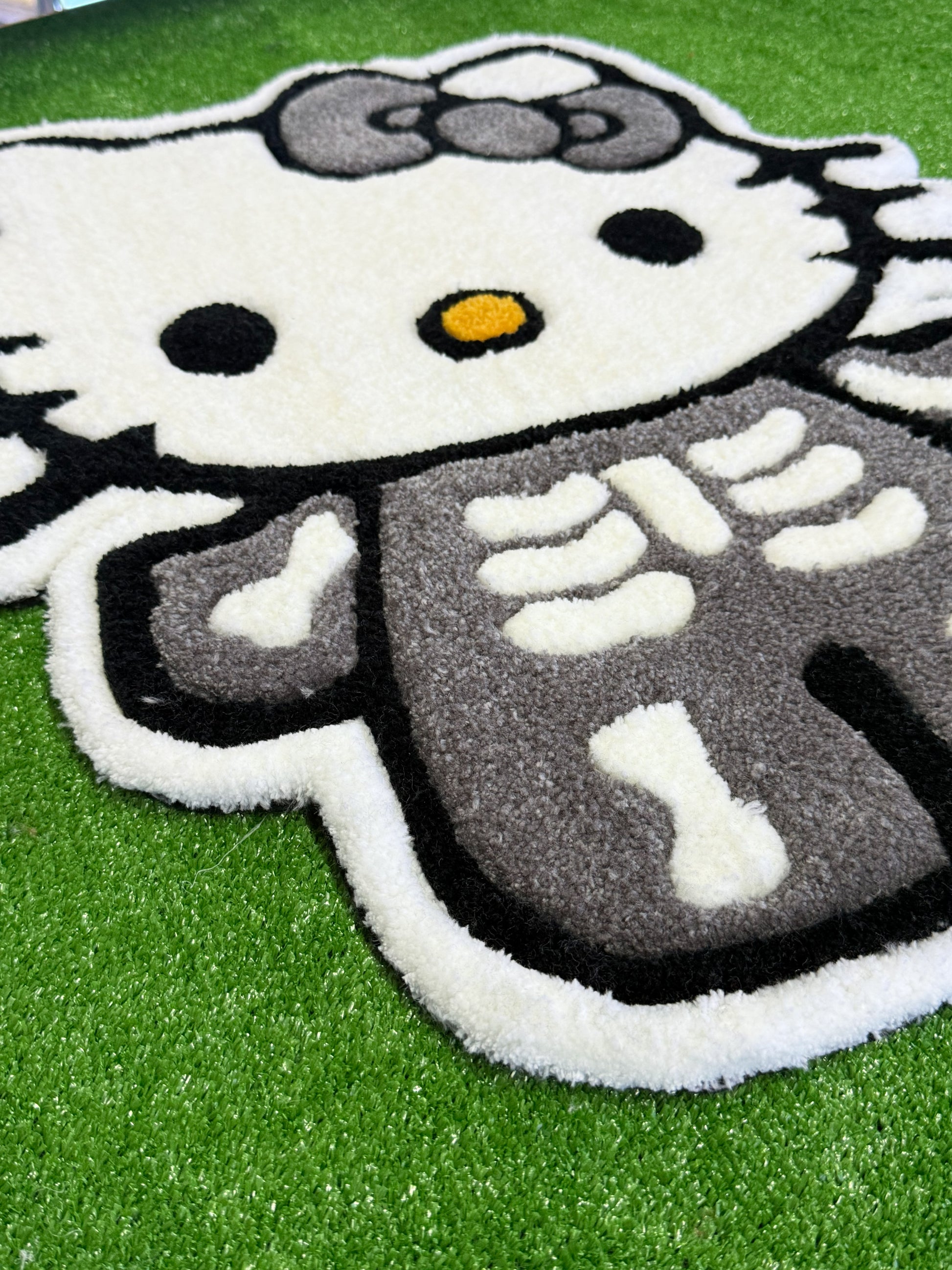Hello Kitty edition 06 | handmade tufted rug; This handmade tufted rug adds a fun touch to kids' rooms with its skeleton costume detail and contrasting black outlines. The plush, high-pile surface is incredibly soft; thanks to its non-slip felt backing, it can be used safely on the floor. With its clean, crisp edge finish and gray bow detail, it is a collectible piece.