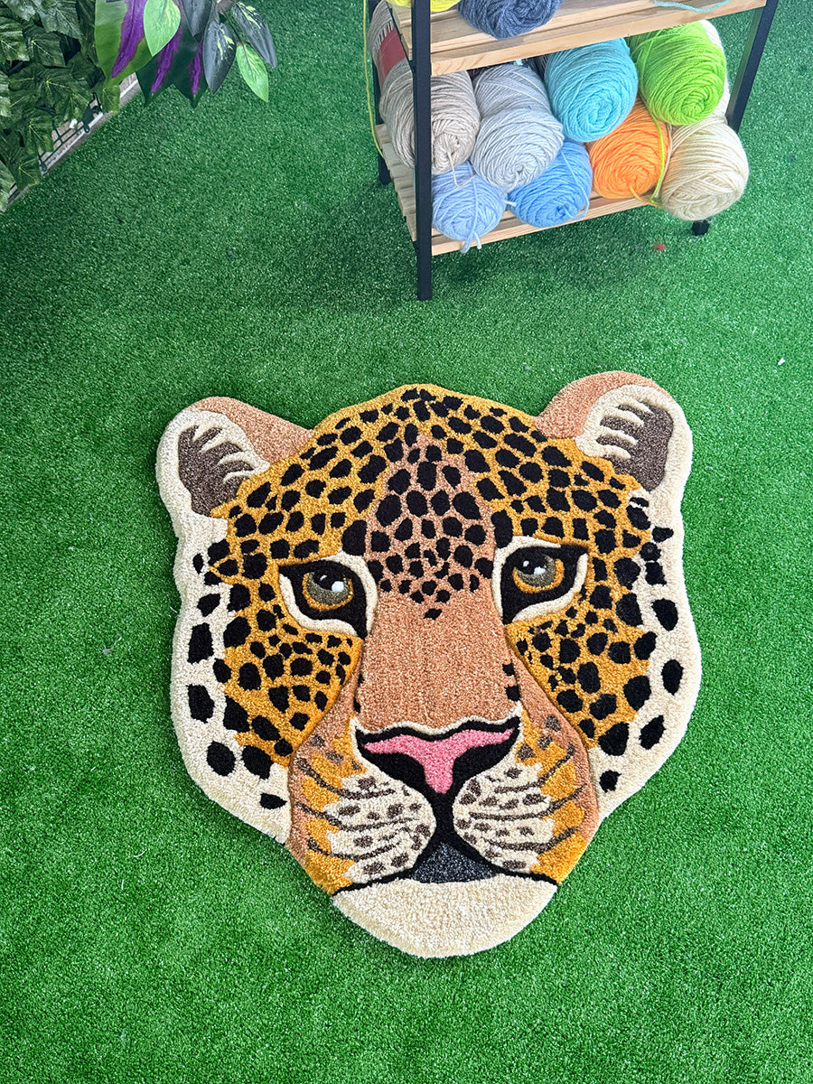 The PANTHERA Edition | Handmade Tufted Rug; adds a touch of the wild to your space with its handcrafted charm. It stands out with its spotted jaguar face and bold black contours. The surface is thick and soft, providing exceptional comfort underfoot. Thanks to its durable structure, it is perfectly suitable for daily use.