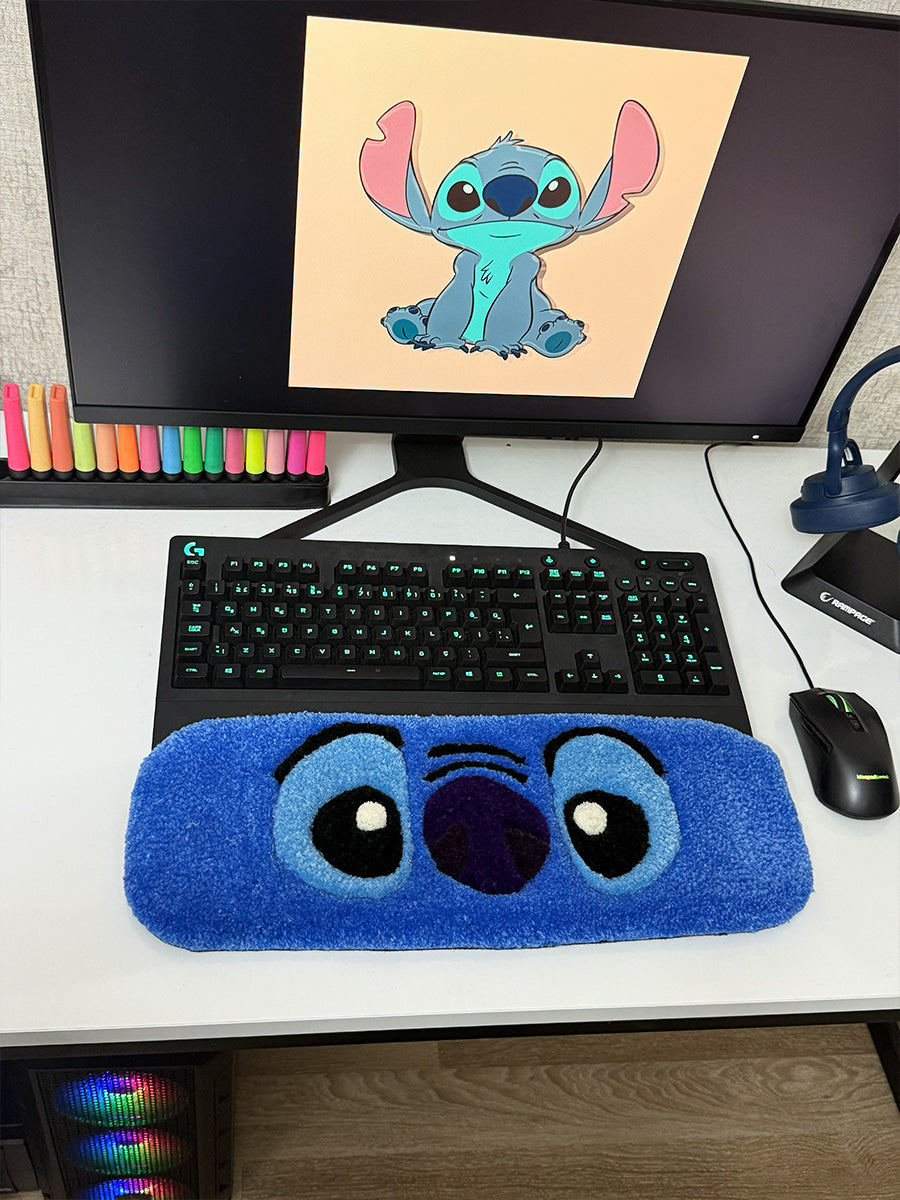 Stitch Edition 02 | Handmade Tufted Keyboard Rug; a handcrafted desktop keyboard rug inspired by the beloved character. With its vibrant blue background, large eye details, and crisp contour lines, it brings energy to your desk. Its plush texture provides comfortable wrist support while typing or gaming. Versatile in use, it functions perfectly as a keyboard rug, wrist rest, or a compact mouse pad; a decorative and functional choice for gaming setups and office desks.