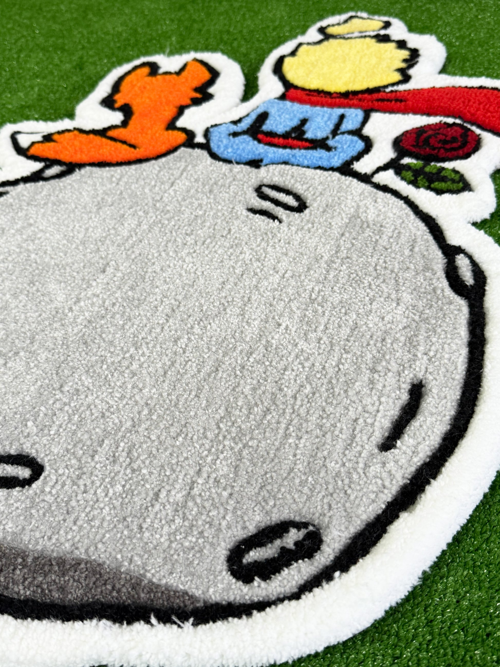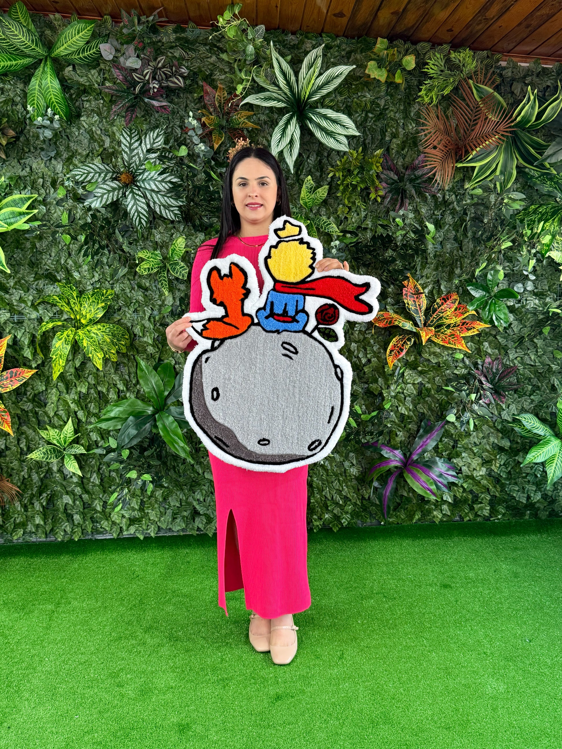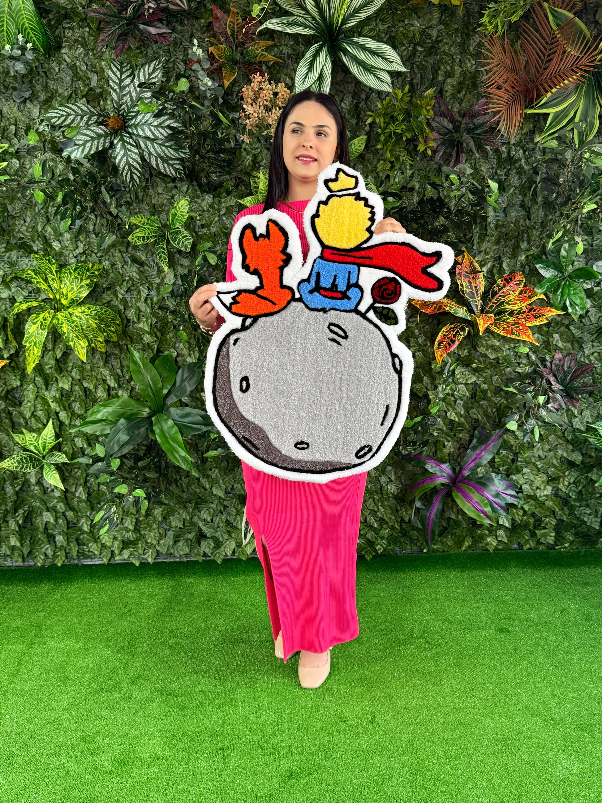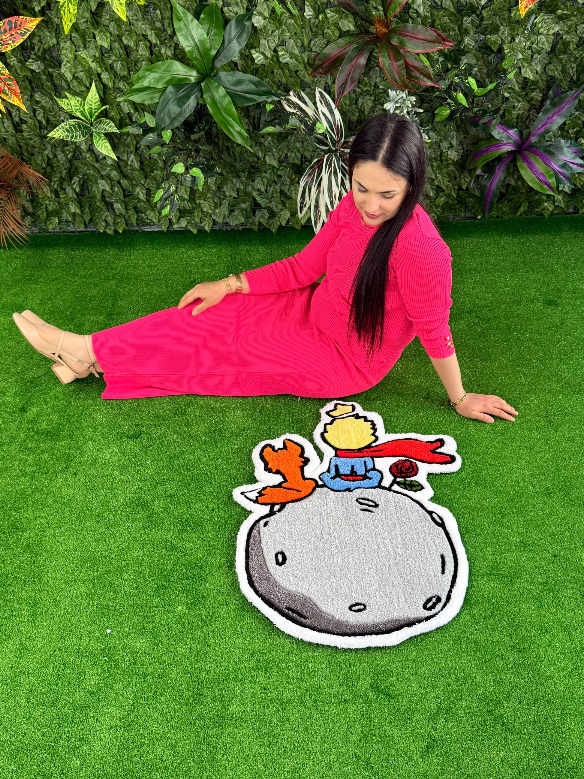 The Little Prince edition | handmade tufted rug; This handmade kids' rug brings the iconic Little Prince, fox, and rose scene to life with a soft, plush tufted texture. The gray planet background, bright red scarf, and vibrant colors add warmth and joy to any room. The edges are neatly carved for a clean, 3D effect. Thanks to its non-slip backing, it can be used safely on the floor, or you can hang it on the wall as a beautiful decorative piece.