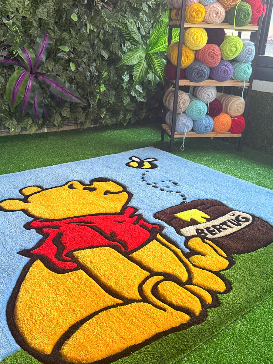Winnie the Pooh Personalized | Handmade Tufted Rug; brings pure joy to any child's room. This handmade piece features Pooh, a cute bee, and a honey pot detail. Customization: We write your child's name directly on the honey pot area; simply leave a note with the name at checkout. Its surface is soft and comfortable, creating a warm and safe play area on the floor.