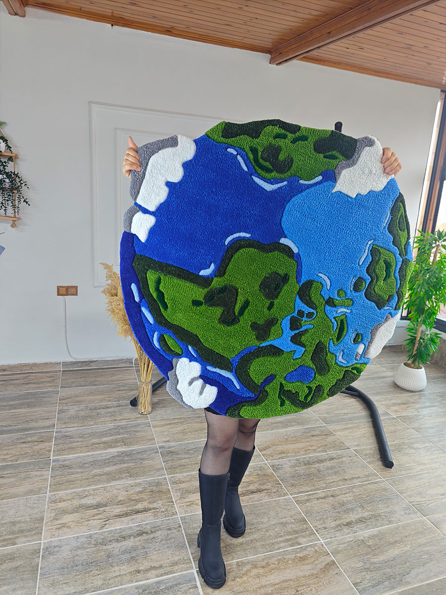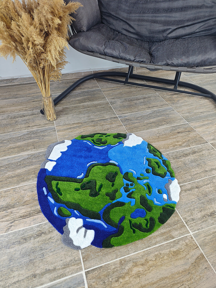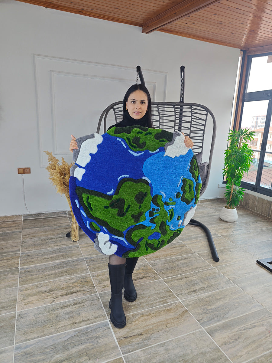 Dünya halı; yaşam alanlarınıza gezegenimizin renklerini ve zarafetini taşıyor! Bu özel tasarım halı, mavi, yeşil ve beyaz tonların uyumuyla Dünya haritasını stilize bir şekilde sunar. Yuvarlak formdaki modern tasarımı, evinizde şıklığı ve doğallığı bir arada sunmak için özenle üretilmiştir.