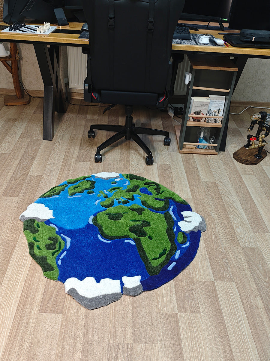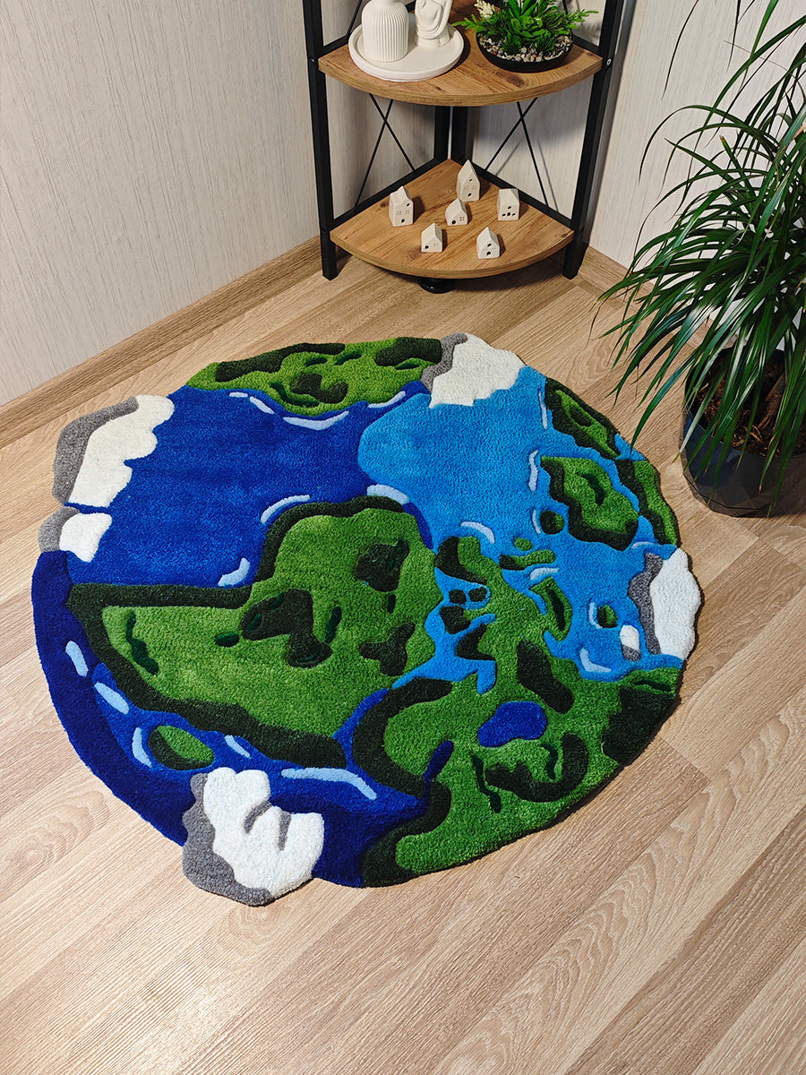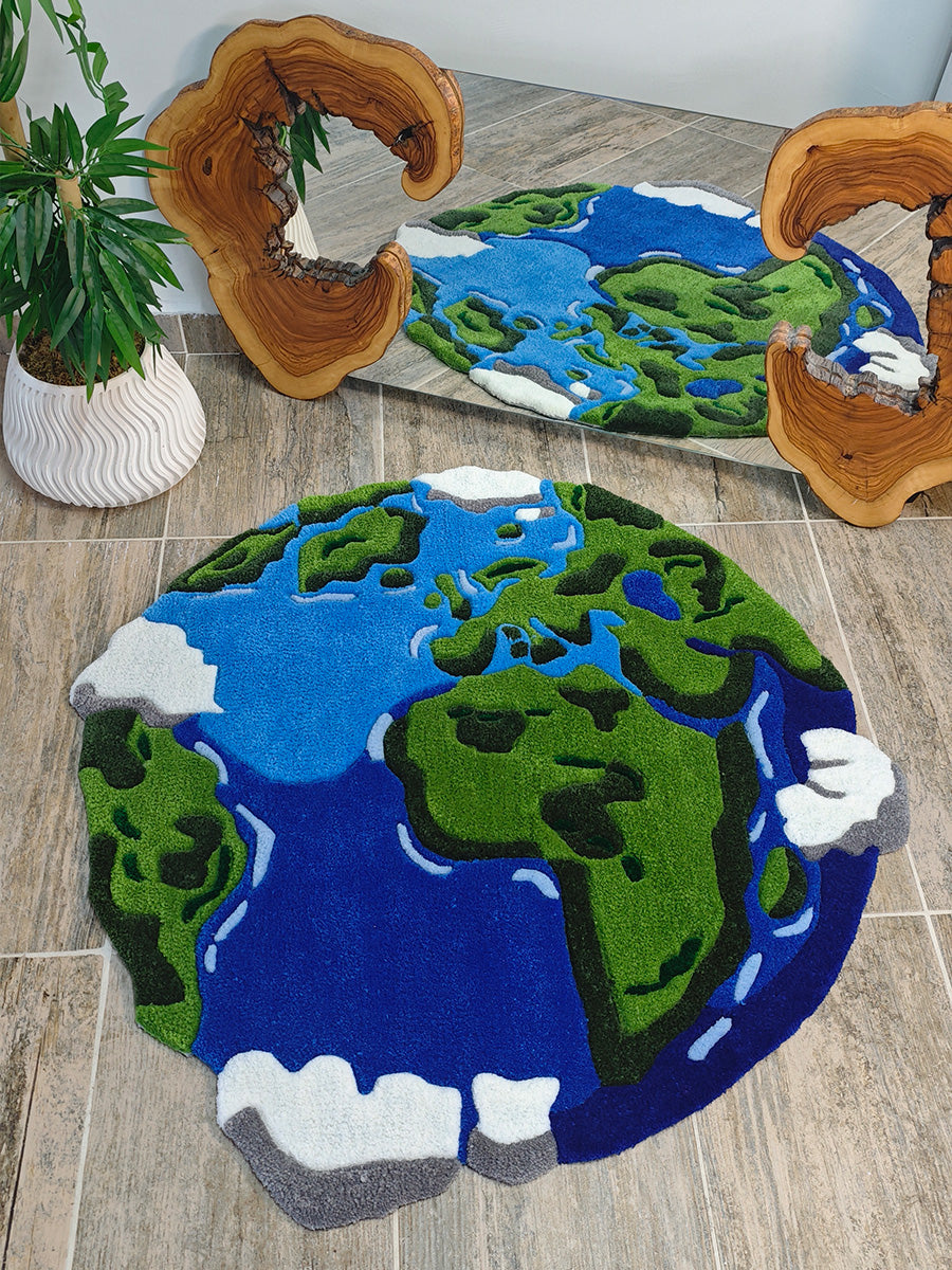 Dünya halı; yaşam alanlarınıza gezegenimizin renklerini ve zarafetini taşıyor! Bu özel tasarım halı, mavi, yeşil ve beyaz tonların uyumuyla Dünya haritasını stilize bir şekilde sunar. Yuvarlak formdaki modern tasarımı, evinizde şıklığı ve doğallığı bir arada sunmak için özenle üretilmiştir.