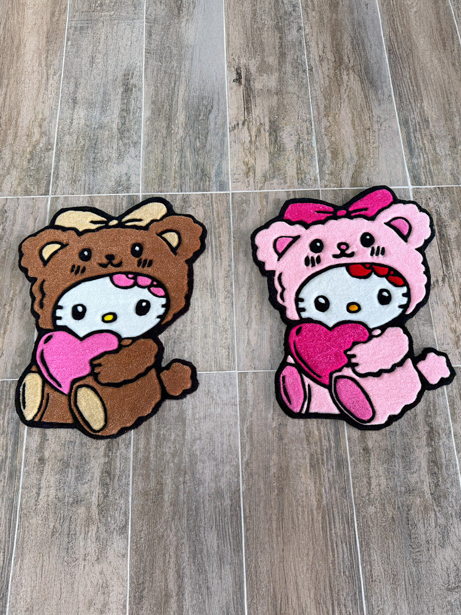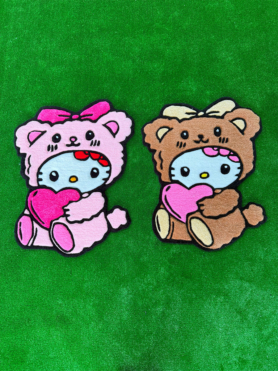 Ayıcıklı Hello Kitty; Hello Kitty karakterinin en tatlı hali, ayıcık kostümüyle karşınızda! Bu özel set, biri kahverengi diğeri pembe tonlarında olmak üzere iki farklı Hello Kitty halısından oluşur. Kalp figürleriyle tamamlanan tasarım, sevimliliğiyle çocuk odalarına sıcaklık ve neşe katıyor. Hem oyun alanlarında hem de dekoratif amaçlı kullanılabilecek bu halı seti, çocuklar için eğlenceli ve yumuşacık bir alan sunar.