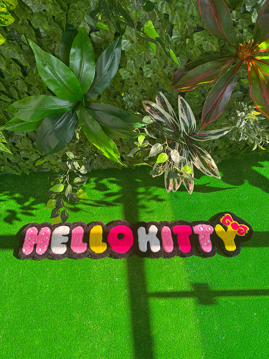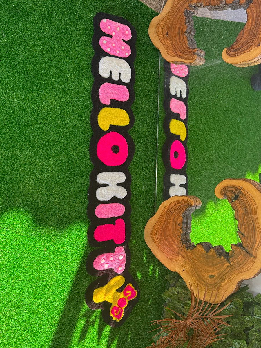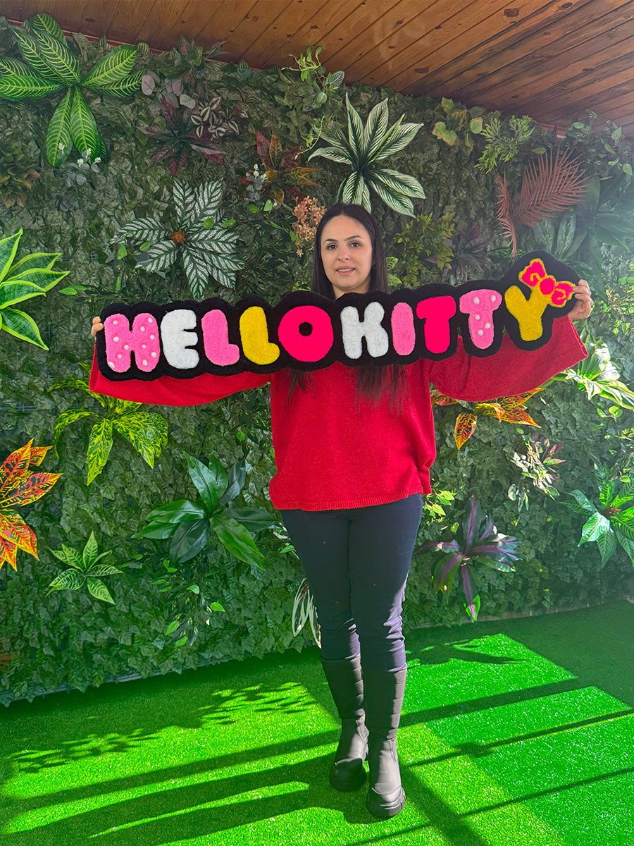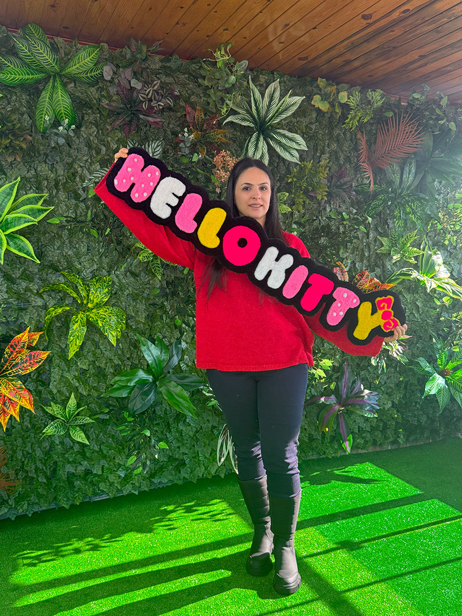 Hello kitty yazısı; rengarenk ve eğlenceli tasarımıyla çocuk odalarına neşe katacak bu özel tufting halı, Hello Kitty yazısının karakteristik ve ikonik çizgileriyle dikkat çekiyor. Her harf farklı bir renkte hazırlanmış olup, alt kısmında yer alan sarı fiyonk detayı tasarıma enerjik bir dokunuş katıyor. Hem duvara asılabilecek hem de yere serilebilecek şekilde kullanılabilir. Çocuk odalarında tematik dekorlar, fotoğraf köşeleri ya da doğum günü arka planlarında harika bir tamamlayıcı olarak tercih edilebilir.