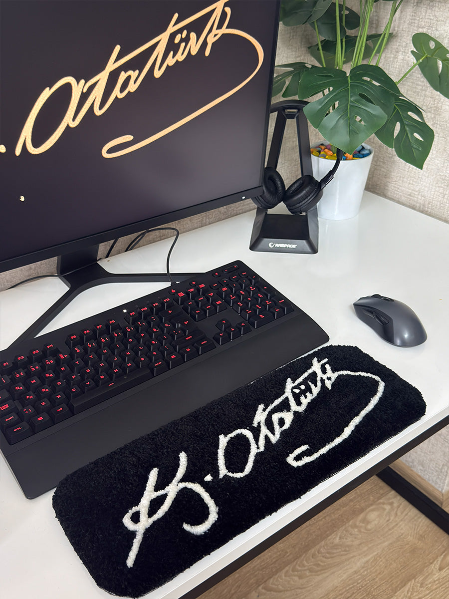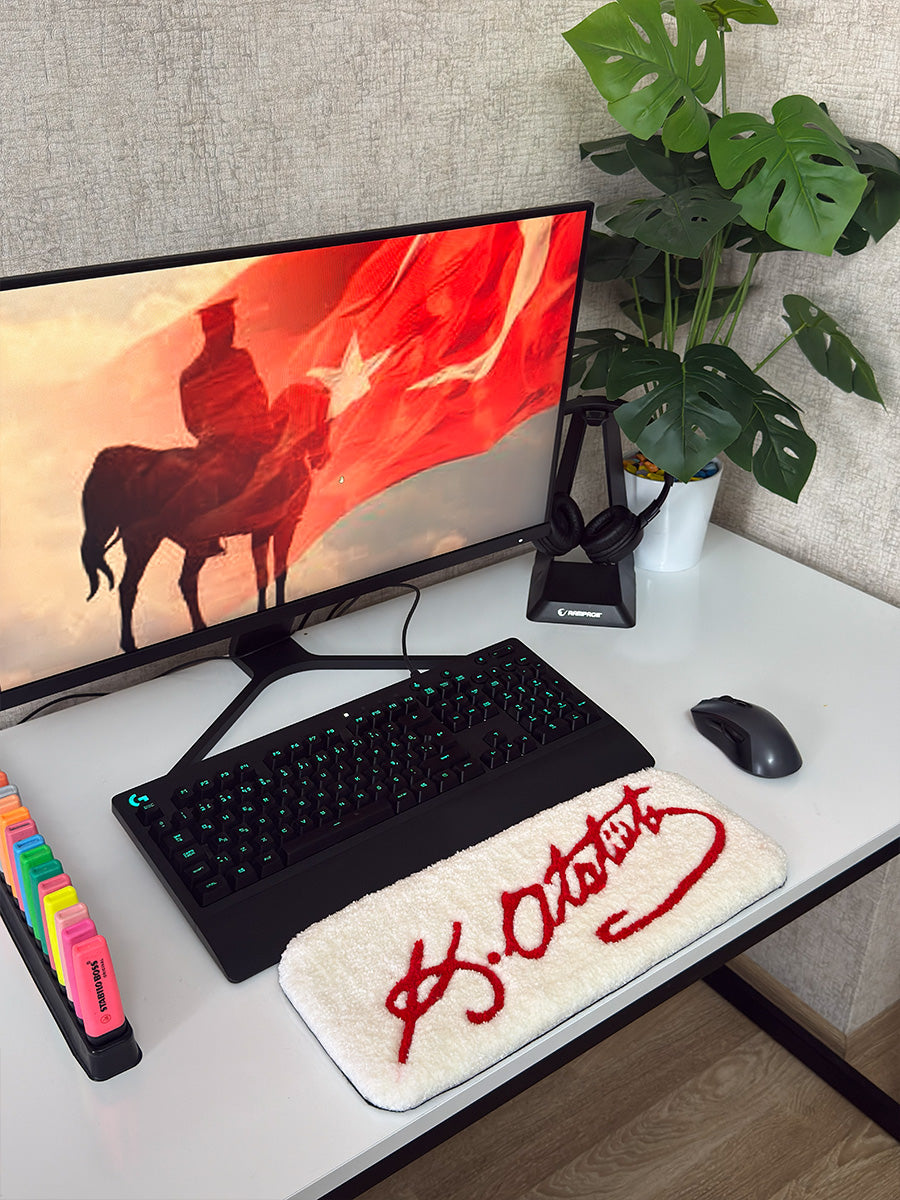 K. Atatürk imza edition | el yapımı tufting klavye pedi; çalışma masanızda Cumhuriyetin asil ruhunu yaşatırken, gün boyu süren bilgisayar kullanımında bileklerinize ihtiyaç duyduğu konforu sunan, estetik ve işlevselliğin mükemmel bir birleşimidir. Ofiste yoğun iş temposunda çalışırken veya evde uzun oyun seanslarında bileklerinizde oluşan baskıyı hafifletmek için tasarlanan bu özel mat, yumuşacık dokusuyla size ergonomik bir destek sağlar. Masanıza hem manevi bir değer hem de modern bir şıklık katan bu tasarım, 8 farklı renk kombinasyonuyla her türlü dekorasyon tarzına ve kişisel zevke uyum sağlayarak çalışma alanınızın vazgeçilmez bir parçası olur.