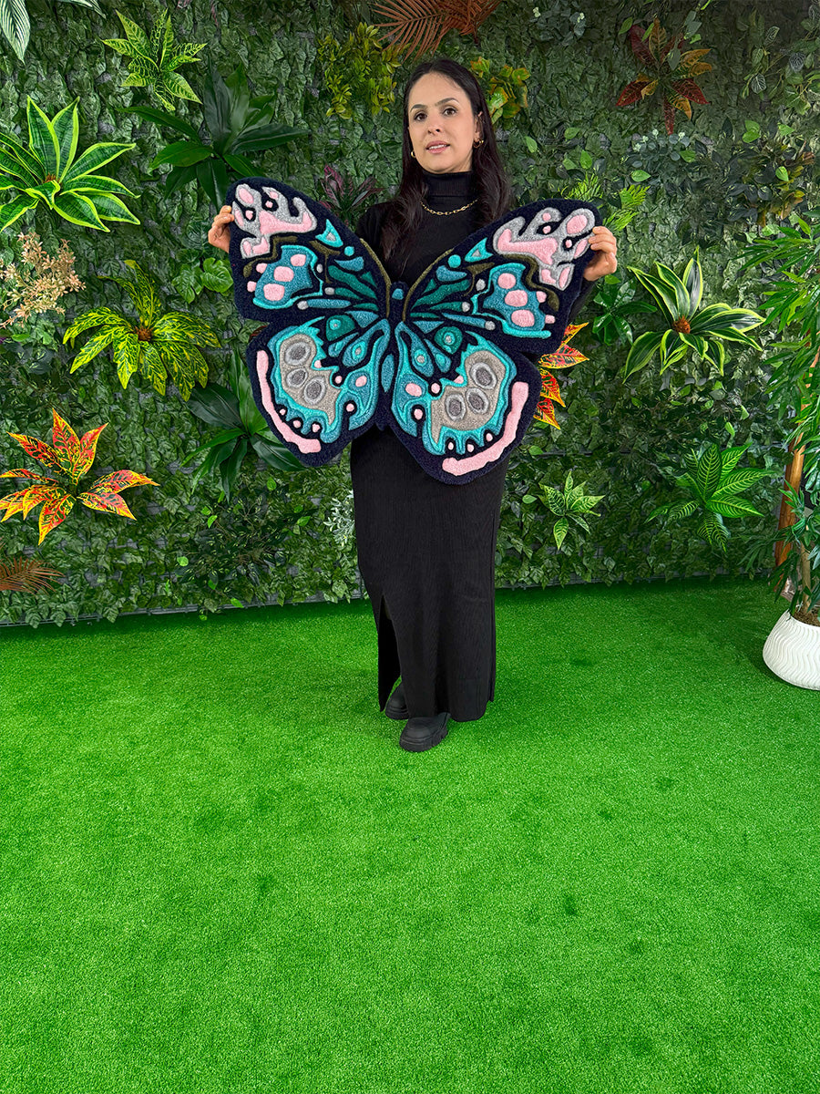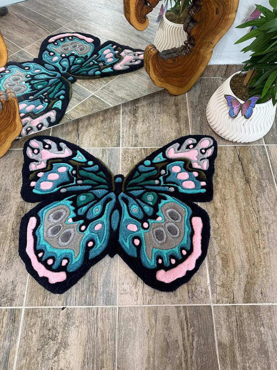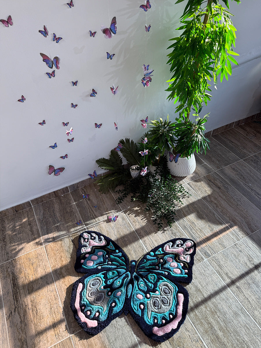 Kelebek Halı; Doğanın zarifliğini yansıtan bu kelebek halı, göz alıcı renk geçişleri ve detaylı işçiliğiyle öne çıkıyor. Pastel pembe, turkuaz ve antrasit tonlarının bir araya geldiği bu tasarım, mekanlarınıza canlı ve yaratıcı bir dokunuş kazandırıyor. Tufting tekniğiyle üretilen özel formu sayesinde, yalnızca bir halı değil, aynı zamanda dekoratif bir sanat parçası işlevi görüyor. Özellikle doğadan ilham alan temalara sahip alanlar için kusursuz bir seçimdir.